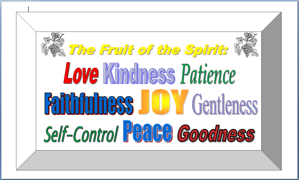 The fruit of the Spirit is love, joy, peace, patience, kindness, goodness, faithfulness, gentleness, and self-control. Galatians 5:22, 23 RSV